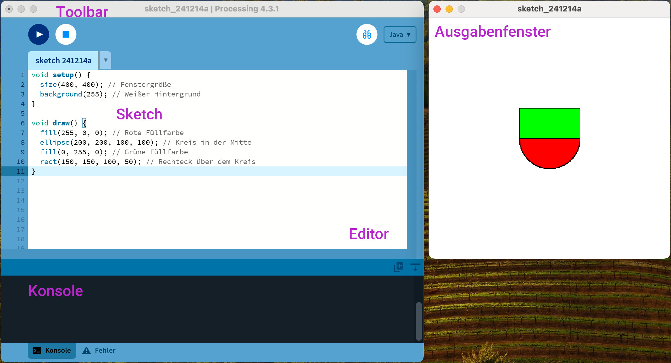 • size(width, height): Definiert die Größe des Zeichenfensters.